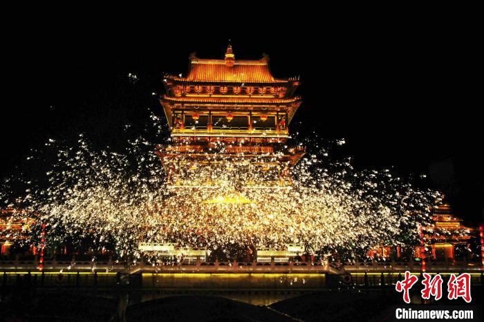 9月3日晚,夜游山東臺(tái)兒莊古城,游客觀“火龍鋼花”非遺表演,乘搖櫓船穿梭如畫夜色中,聽酒吧歌手淺吟低唱,沉浸在流光溢彩的夜生活中。 圖為“火龍鋼花”非遺表演璀璨壯觀,吸引游客隔岸觀賞!≮w曉 攝