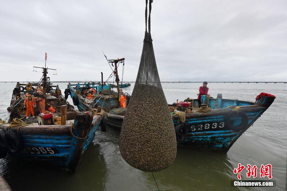 漁民從船上吊裝豐收的蛤蜊上岸。王海濱 攝