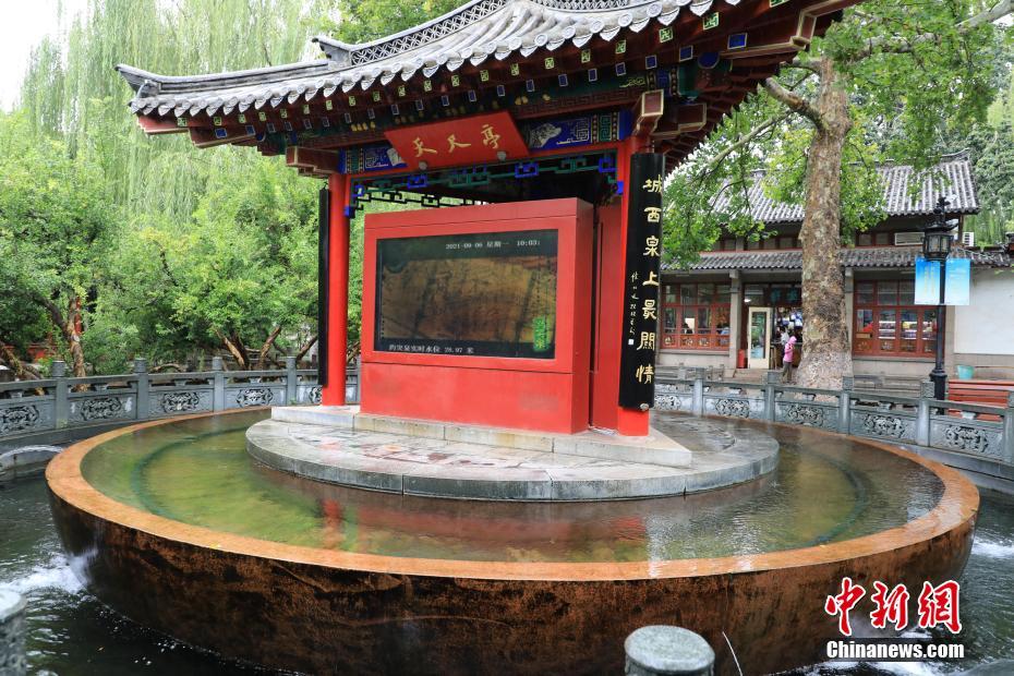9月6日,山東濟南,天尺亭顯示趵突泉實時水位。連續(xù)三日綿密的秋雨使?jié)先骸帮栵嫛备柿兀?2名泉全部噴涌。趵突泉實現(xiàn)自2003年9月6日復涌至今的“18年連噴”,濟南72名泉水位最高的月牙泉重現(xiàn)“月牙飛瀑”奇觀。 中新社記者 李欣 攝