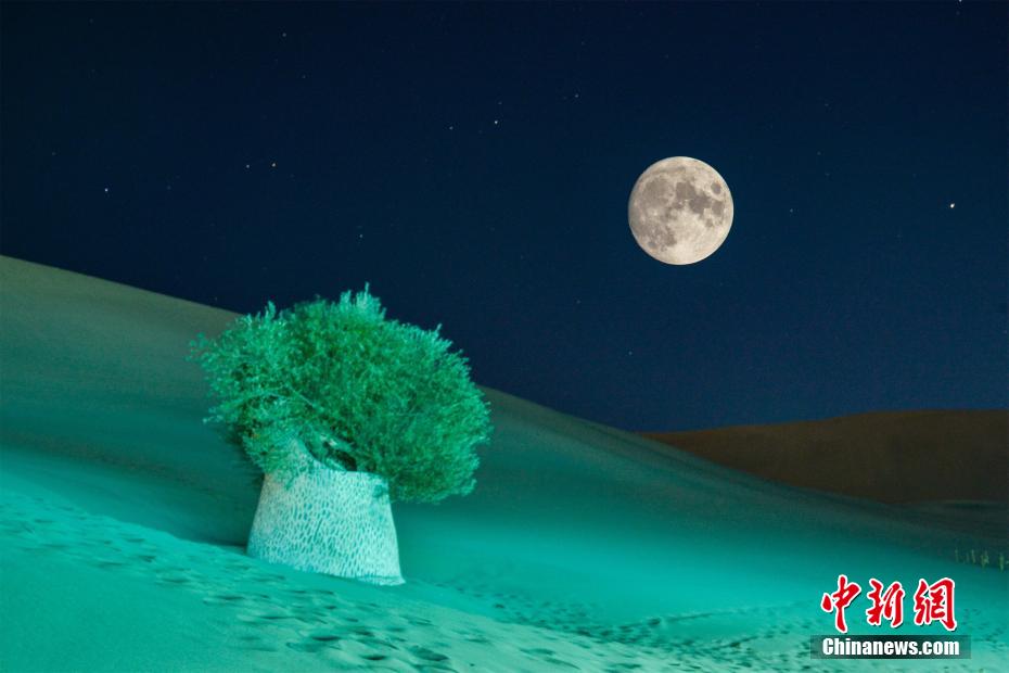 9月21日晚,一輪超級明月升起在大漠敦煌的上空,在中國傳統(tǒng)節(jié)日中秋節(jié),甘肅酒泉市敦煌月牙泉小鎮(zhèn)中心廣場舉辦了中秋拜月等民俗活動,民眾賞月、拜月,共話團(tuán)圓。王斌銀 攝