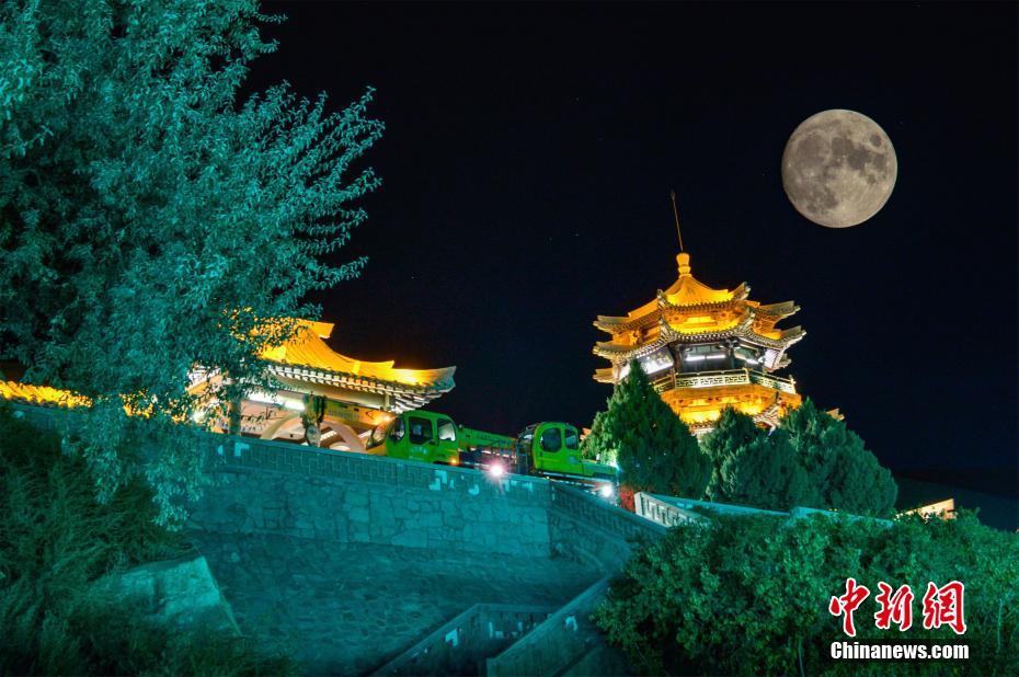 9月21日晚,一輪超級明月升起在大漠敦煌的上空。王斌銀 攝