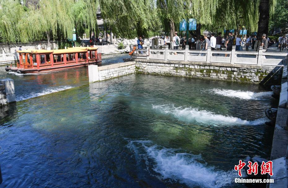 9月21日,山東濟南,游客乘船觀賞黑虎泉“黑虎嘯月”景觀。連日降雨致濟南地下水位持續(xù)上漲,濟南72名泉全部恢復(fù)噴涌。 中新社記者 張勇 攝