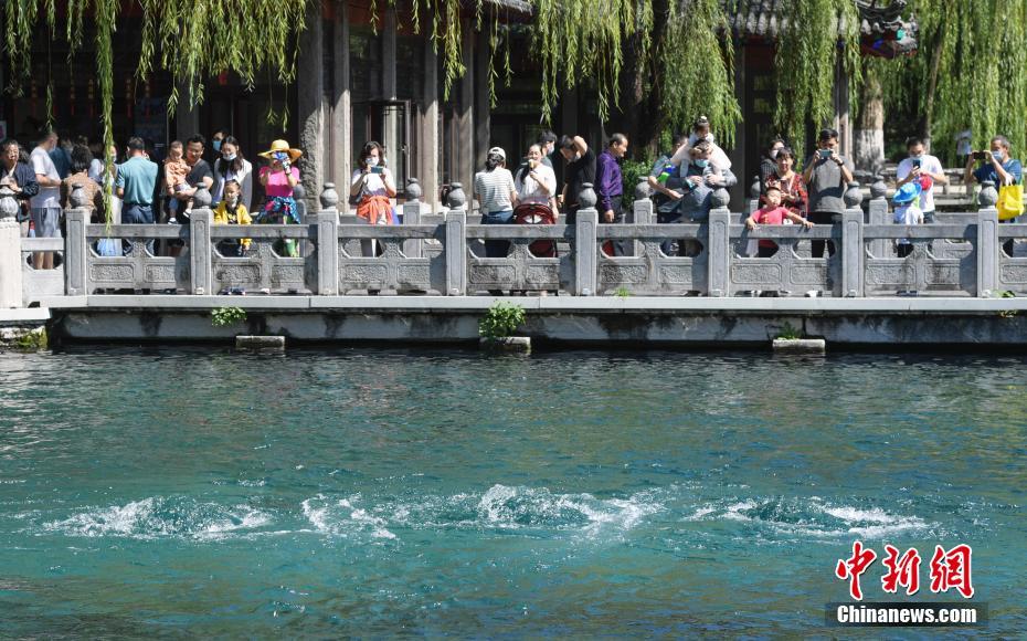 9月21日,山東濟(jì)南,游客乘船觀賞黑虎泉“黑虎嘯月”景觀。連日降雨致濟(jì)南地下水位持續(xù)上漲,濟(jì)南72名泉全部恢復(fù)噴涌。 中新社記者 張勇 攝