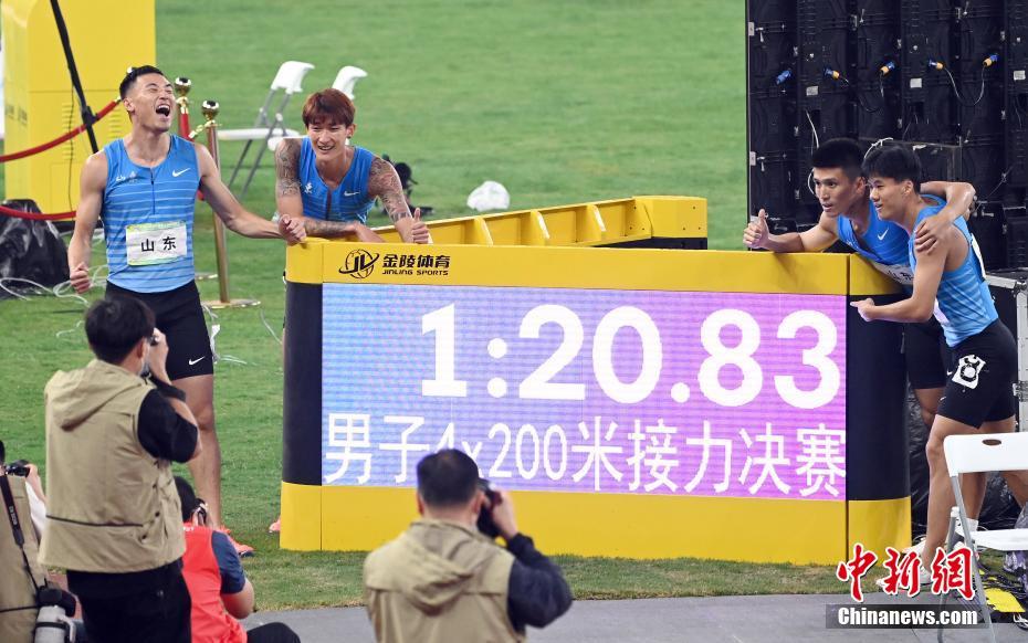 9月23日晚,在西安舉行的第十四屆全運(yùn)會(huì)田徑男子4X200米接力決賽中,山東隊(duì)以微弱優(yōu)勢(shì)戰(zhàn)勝蘇炳添領(lǐng)銜的廣東隊(duì)奪冠,并創(chuàng)造了該項(xiàng)目的賽會(huì)紀(jì)錄。圖為山東隊(duì)隊(duì)員在計(jì)時(shí)牌前慶祝。 中新社記者 毛建軍 攝