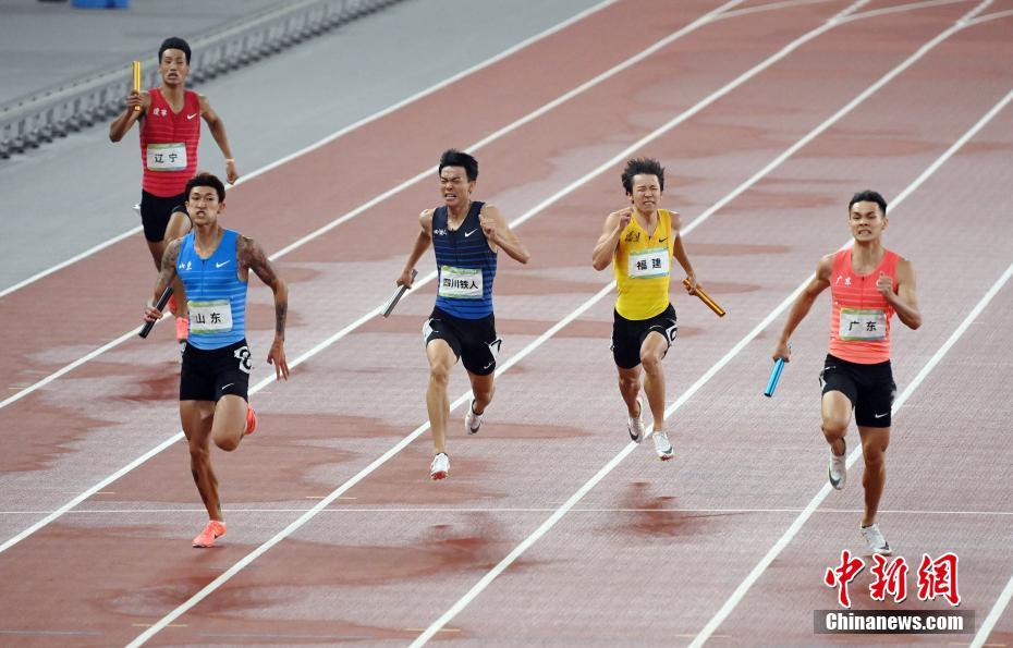 9月23日晚,在西安舉行的第十四屆全運會田徑男子4X200米接力決賽中,山東隊以微弱優(yōu)勢戰(zhàn)勝蘇炳添領銜的廣東隊奪冠,廣東隊屈居亞軍。圖為選手們在比賽中。 中新社記者 毛建軍 攝