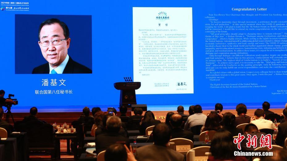9月27日,“2021中國(曲阜)國際孔子文化節(jié) 第七屆尼山世界文明論壇”在孔子誕生地曲阜尼山舉行。圖為聯(lián)合國第八任秘書長潘基文向論壇致賀信。 中新社記者 梁犇 攝