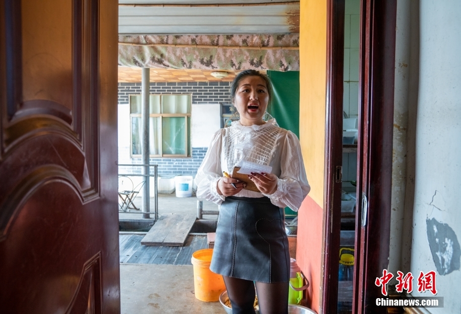 陳恒花在自家經(jīng)營的飯店吆喝“菜譜”,讓后廚下鍋。史春陽 攝