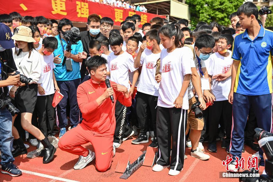 10月12日,廣東省中山市,蘇炳添指導(dǎo)學(xué)弟學(xué)妹跑步技巧。當(dāng)日,蘇炳添現(xiàn)身中山,回到母!猩绞畜w育運動學(xué)校參加歡迎會并現(xiàn)場教學(xué)跑步技巧。 中新社記者 陳驥旻 攝