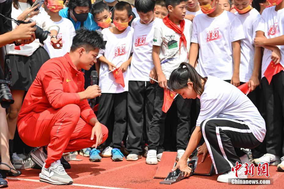 10月12日,廣東省中山市,蘇炳添指導(dǎo)學(xué)妹跑步技巧。當(dāng)日,蘇炳添現(xiàn)身中山,回到母!猩绞畜w育運(yùn)動(dòng)學(xué)校參加歡迎會(huì)并現(xiàn)場(chǎng)教學(xué)跑步技巧。 中新社記者 陳驥旻 攝