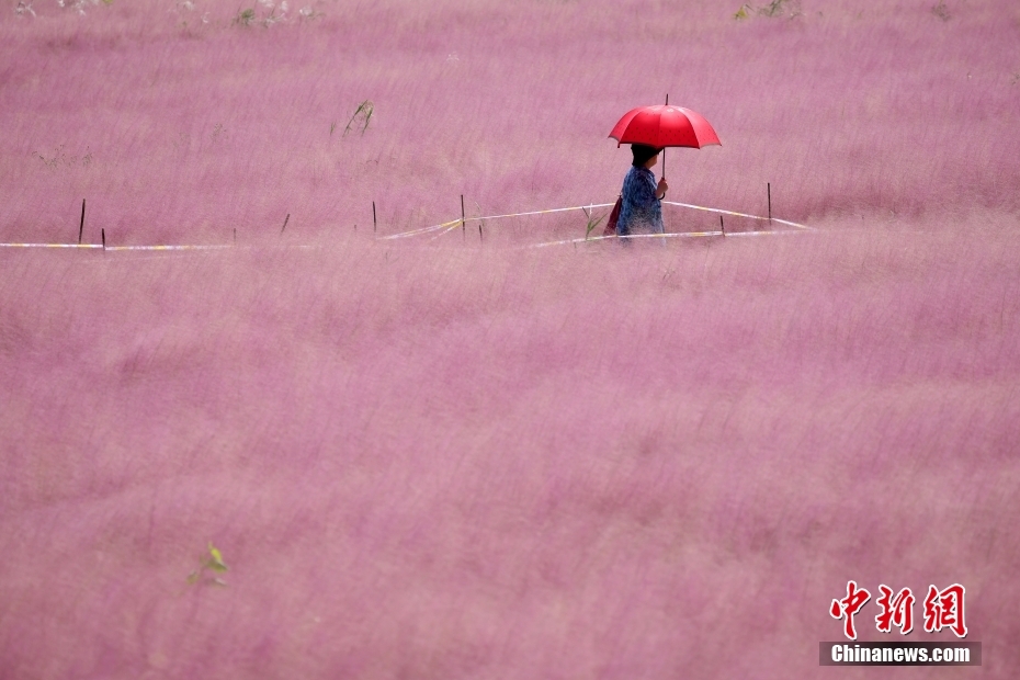 10月12日,江蘇省南京市雨花臺區(qū)三橋濕地公園內(nèi),盛開的粉黛亂子草曼妙輕盈,如煙似霧,吸引了不少市民和游客前來欣賞“粉色花!薄D為市民在粉黛亂子草中間過道上休閑。 中新社記者 泱波 攝