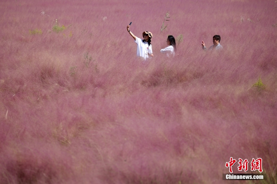 圖為市民在粉黛亂子草中間過道上拍攝照片。 中新社記者 泱波 攝