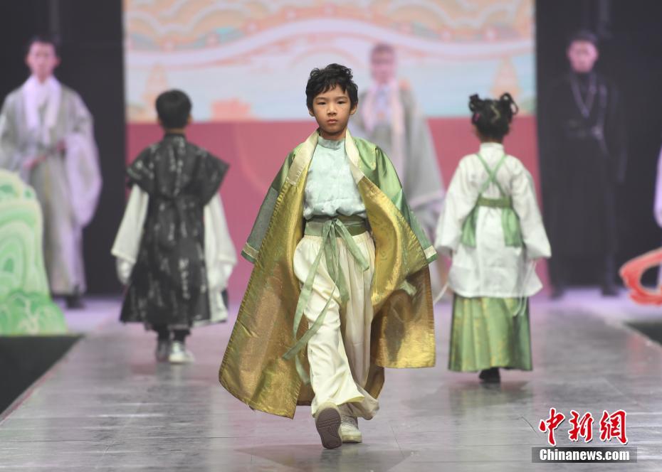 10月17日,小模特身著華服進(jìn)行走秀展示。當(dāng)日,“絲鹿東方·華服LIVE秀”亮相浙江杭州,演繹中國(guó)傳統(tǒng)服飾之美。 中新社記者 王剛 攝
