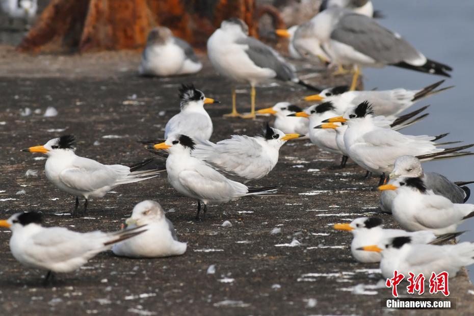 2021年10月21日,37只珍稀鳥類中華鳳頭燕鷗出現(xiàn)在山東省青島市膠州灣海洋公園紅島段,為候鳥遷徙季涂上一筆亮麗的色彩。據(jù)了解,中華鳳頭燕鷗別稱黑嘴端鳳頭燕鷗,屬于極度瀕危鳥種之一,目前全球數(shù)量已超過100只。由于種群數(shù)量稀少,難得一見,被鳥類學家稱為“神話之鳥”。圖為成群中華鳳頭燕鷗和紅嘴鷗在青島市膠州灣海洋公園紅島段棲息。 中新社發(fā) 王海濱 攝 圖片來源:CNSPHOTO