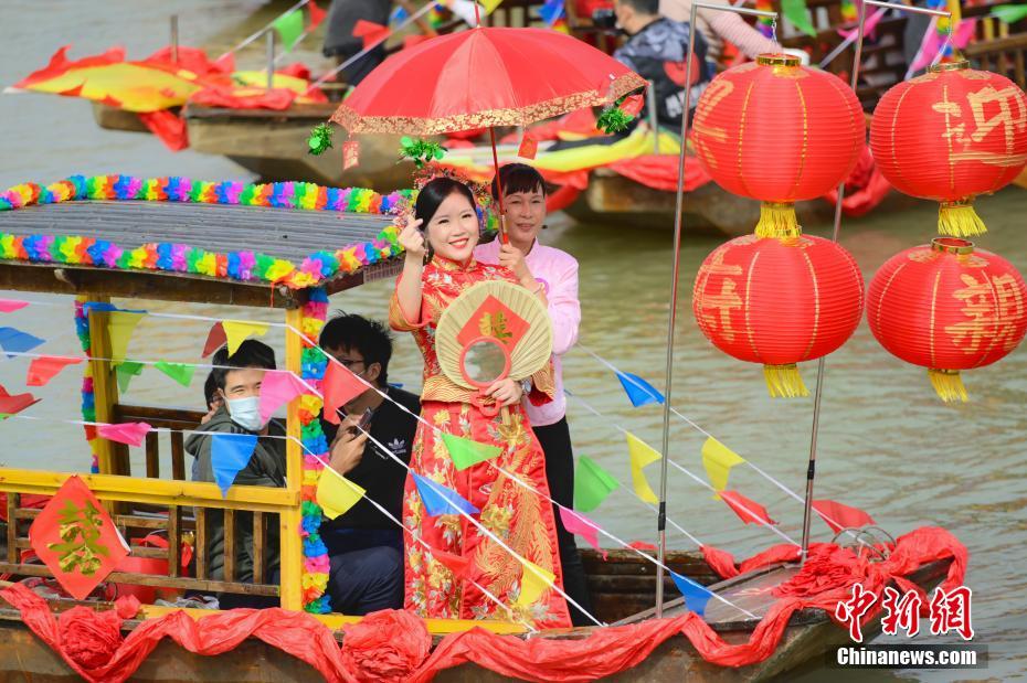 10月24日,搭載新娘的花船航行在河道中。當(dāng)日,第十屆“斗門水上婚嫁”集體婚禮在珠海斗門的南澳村舉辦,18對新人體驗“水上婚嫁”!岸烽T水上婚嫁”是國家級非物質(zhì)文化遺產(chǎn)項目,禮儀主要包括“坐高堂”“花船迎親”“回門”等。 中新社記者 陳驥旻 攝