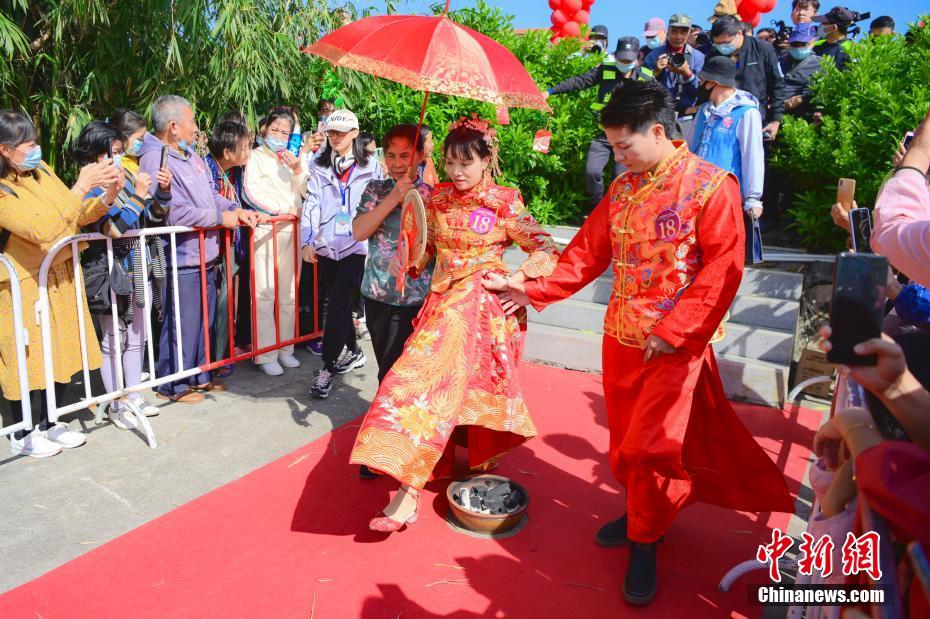 10月24日,新娘手牽新郎“跨火盆”。當日,第十屆“斗門水上婚嫁”集體婚禮在珠海斗門的南澳村舉辦,18對新人體驗“水上婚嫁”!岸烽T水上婚嫁”是國家級非物質(zhì)文化遺產(chǎn)項目,禮儀主要包括“坐高堂”“花船迎親”“回門”等。 中新社記者 陳驥旻 攝