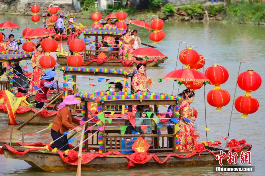 10月24日,搭載新娘的花船航行在河道中。當(dāng)日,第十屆“斗門水上婚嫁”集體婚禮在珠海斗門的南澳村舉辦,18對新人體驗(yàn)“水上婚嫁”!岸烽T水上婚嫁”是國家級非物質(zhì)文化遺產(chǎn)項(xiàng)目,禮儀主要包括“坐高堂”“花船迎親”“回門”等。 中新社記者 陳驥旻 攝