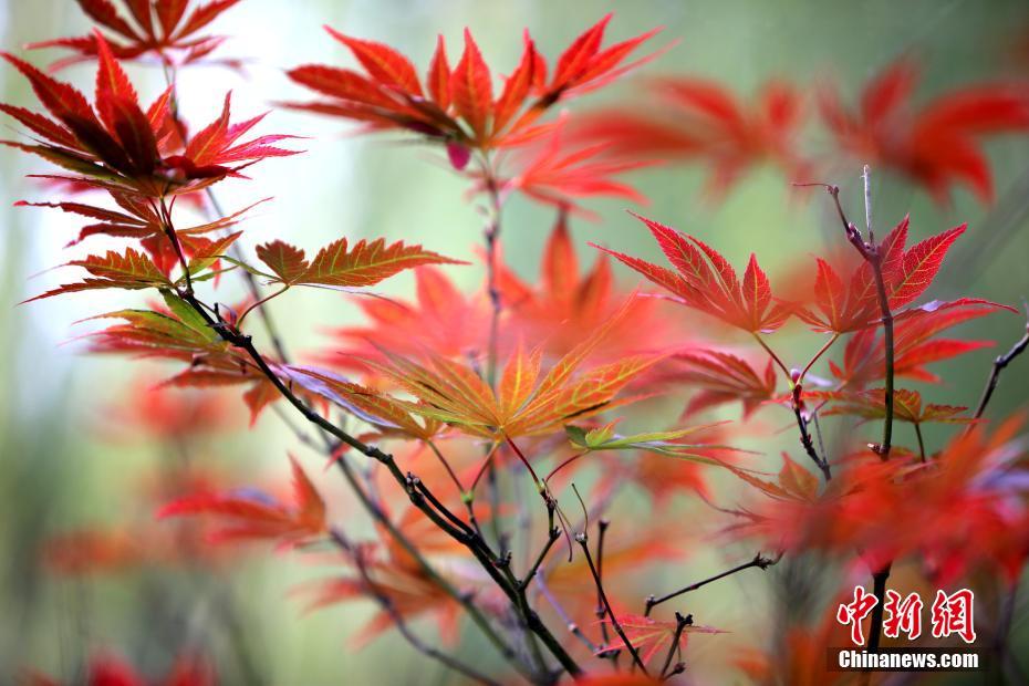 10月26日,江蘇省淮安市,清晏公園楓葉經(jīng)過秋雨浸潤逐漸變紅。中新社發(fā) 周長國 攝 圖片來源:CNSPHOTO