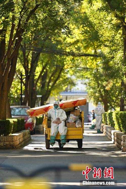 10月27日,工作人員統(tǒng)一為小區(qū)居民派送各類生活物資及快遞。中新社記者 張興龍 攝