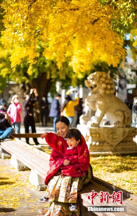 10月31日,家長帶著孩子在位于北京市海淀區(qū)的五塔寺內(nèi)欣賞金秋美景,拍照留念。中新社記者 侯宇 攝
