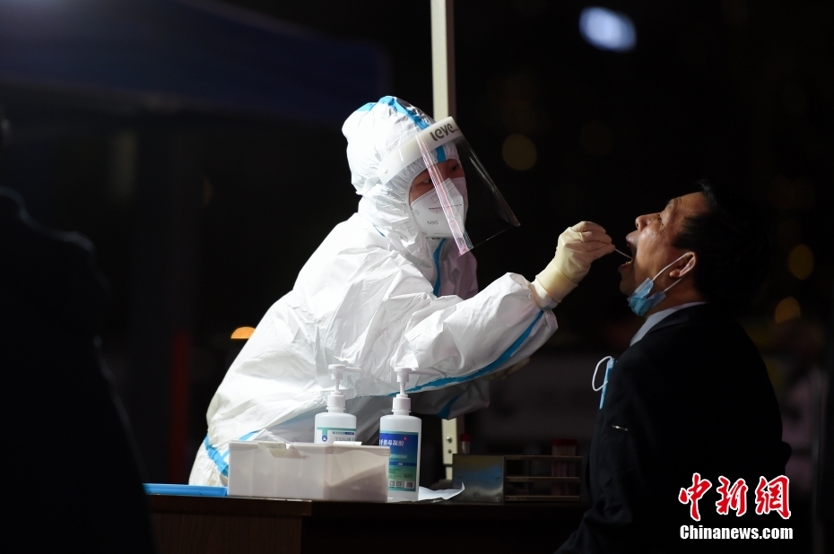 11月2日晚,重慶市南岸區(qū)彈子石街道王家沱社區(qū)核酸采樣點(diǎn),醫(yī)護(hù)人員為居民做核酸檢測。 中新社記者 何蓬磊 攝