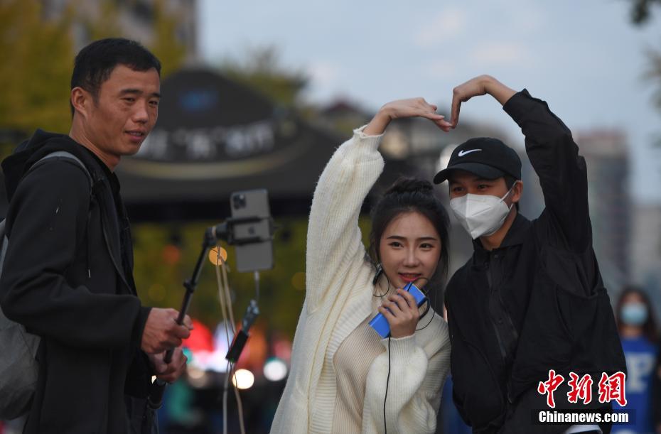 11月3日,一名主播(中)和西湖邊游客(右)在直播中互動。浙江杭州西湖邊的湖濱路步行街自開街以來,隨著人氣不斷增加,越來越多的網(wǎng)絡主播選擇在步行街進行戶外直播。 中新社記者 王剛 攝