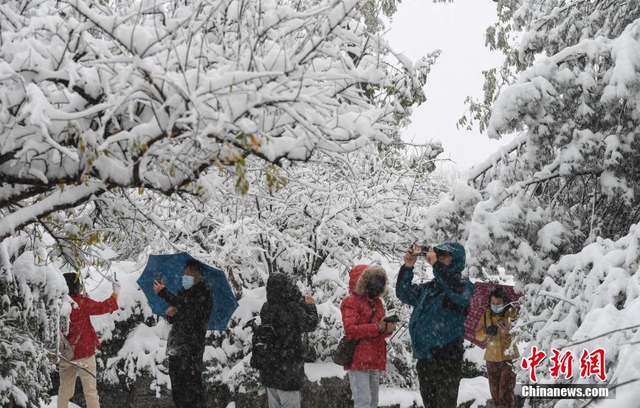 11月7日,市民在山東省濟南市大明湖景區(qū)賞雪拍照。當天是中國二十四節(jié)氣中的“立冬”,濟南迎來今冬首場降雪。 中新社記者 張勇 攝