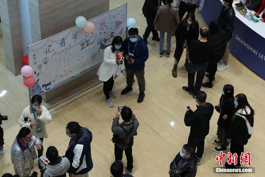 11月8日是第22個(gè)中國記者節(jié),在位于上海的第四屆中國國際進(jìn)口博覽會(huì)新聞中心,白板上寫下的祝福語吸引媒體記者拍照。 中新社記者 蔣啟明 攝