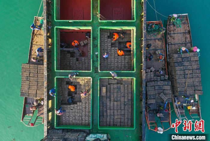 11月14日,在山東省榮成市俚島灣鮑魚養(yǎng)殖區(qū),養(yǎng)殖戶抓緊時間將鮑魚裝船發(fā)往福建海域繼續(xù)養(yǎng)殖。這批將赴福建海域“越冬”的鮑魚達550萬頭。