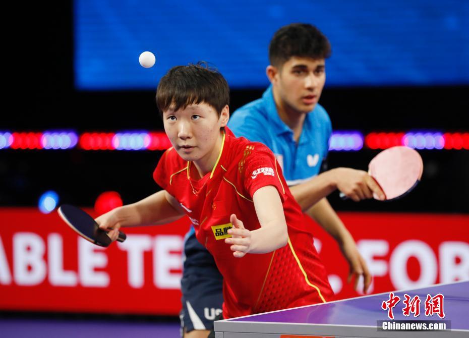 當(dāng)?shù)貢r(shí)間11月22日,正在美國(guó)休斯敦備戰(zhàn)世乒賽的兩對(duì)中美跨國(guó)混雙組合進(jìn)行合練。第56屆世界乒乓球錦標(biāo)賽混雙比賽將于當(dāng)?shù)貢r(shí)間11月23日在休斯敦拉開(kāi)戰(zhàn)幕,中國(guó)男乒選手林高遠(yuǎn)將搭檔美國(guó)女隊(duì)一號(hào)主力張安、美國(guó)男乒選手卡納克將搭檔中國(guó)女乒選手王曼昱參加該項(xiàng)目的角逐。圖為王曼昱(前)與卡納克參加訓(xùn)練。 中新社記者 劉關(guān)關(guān) 攝