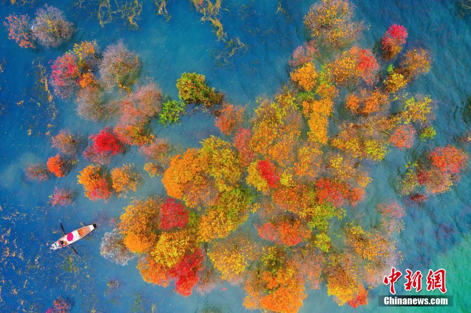 11月21日,初冬時節(jié),航拍贛江江西省吉安市吉水縣金灘鎮(zhèn)水域,一片紅樹林景色格外迷人。水中的紅樹林傲人挺立,一眼望去,可看到大紅、橘紅、橙黃等各種色彩的楓葉,在這些紅楓林的陪襯下,這片水域顯得格外溫馨、祥和。 李小明 攝