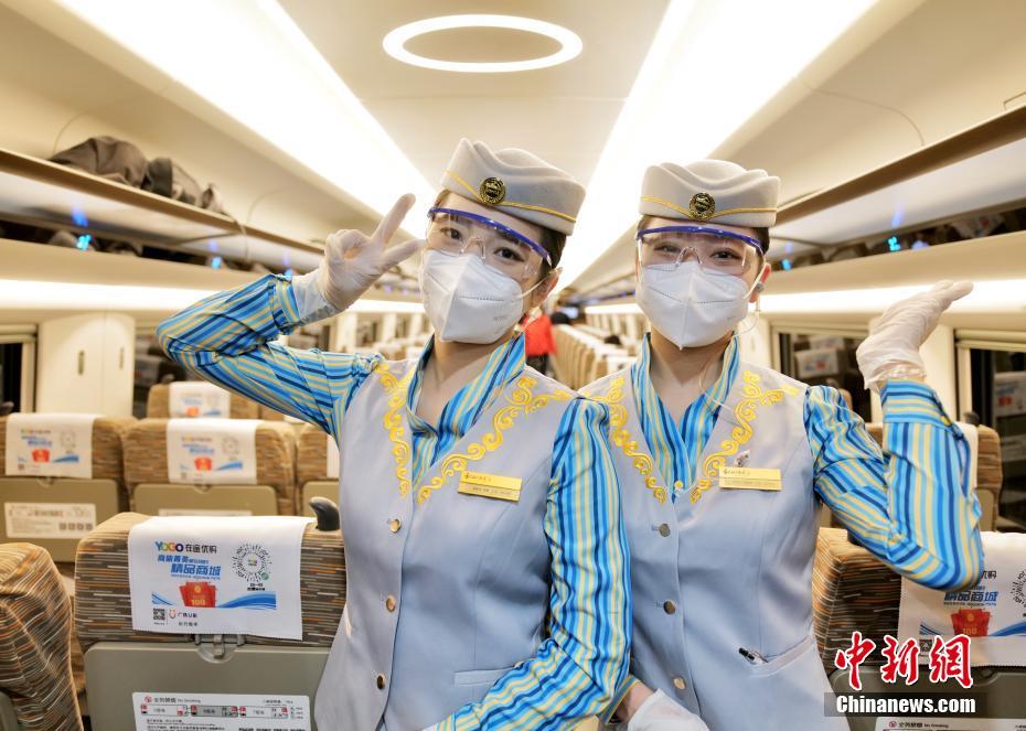 12月1日,媒體記者乘坐G4582次高鐵從深圳北開(kāi)往贛州西的試運(yùn)行列車(chē)進(jìn)行體驗(yàn)。贛深高鐵全線通車(chē)進(jìn)入倒計(jì)時(shí)。圖為贛深高鐵試運(yùn)行列車(chē)上的餐飲服務(wù)工作人員。 中新社記者 陳文 攝