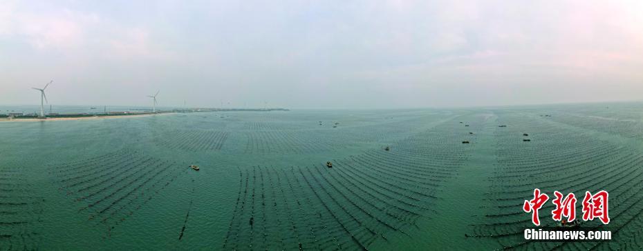 2021年12月6日,山東省榮成市石島管理區(qū)東楮島海洋牧場(chǎng),最后一批海帶苗“插秧”完工,養(yǎng)殖工人在整理海帶架子。 中新社發(fā) 楊志禮 攝 圖片來源:CNSPHOTO