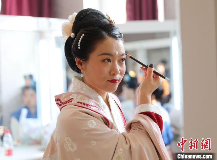 12月11日,在河北省固安大劇院廣場,漢服文化愛好者正在化妝!堑 攝