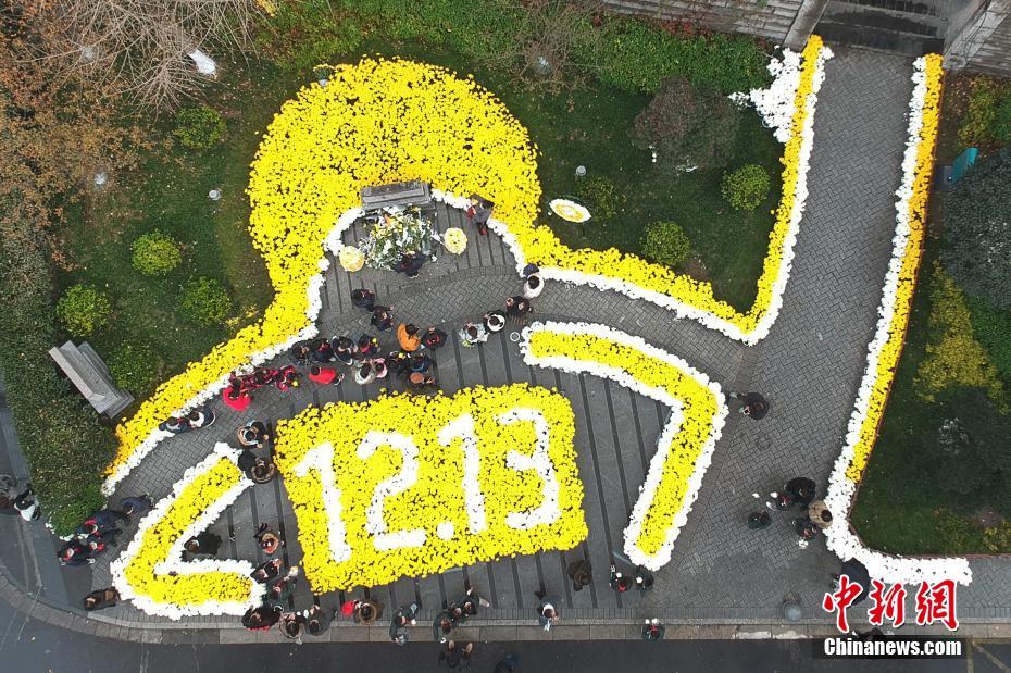 圖為小學(xué)生在侵華日軍南京大屠殺遇難同胞正覺寺叢葬地悼念遇難同胞。(無人機照片) 中新社記者 泱波 攝