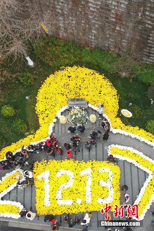 圖為侵華日軍南京大屠殺遇難同胞正覺寺叢葬地,菊花組成了“1213”字樣。(無人機照片) 中新社記者 泱波 攝