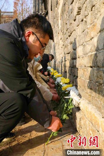 民眾在彈孔墻前,為先烈敬獻(xiàn)鮮花。 侯甜 攝