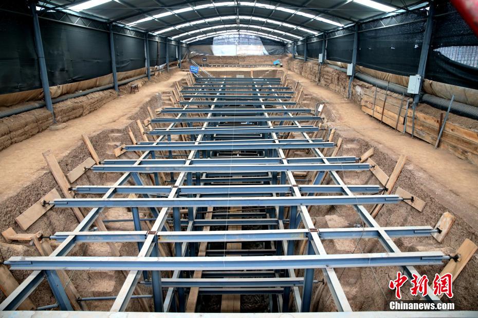 江村大墓外藏坑已被搭起鋼架。 張遠 攝