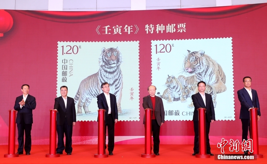 1月5日,《壬寅年》特種郵票首發(fā)儀式在位于北京的中國國家博物館舉行,《壬寅年》特種郵票是中國生肖郵票第四輪中的第七套,一套兩枚,分別命名為“國運昌隆”和“虎蘊吉祥”。圖為嘉賓為《壬寅年》特種郵票揭幕。 中新社記者 張宇 攝