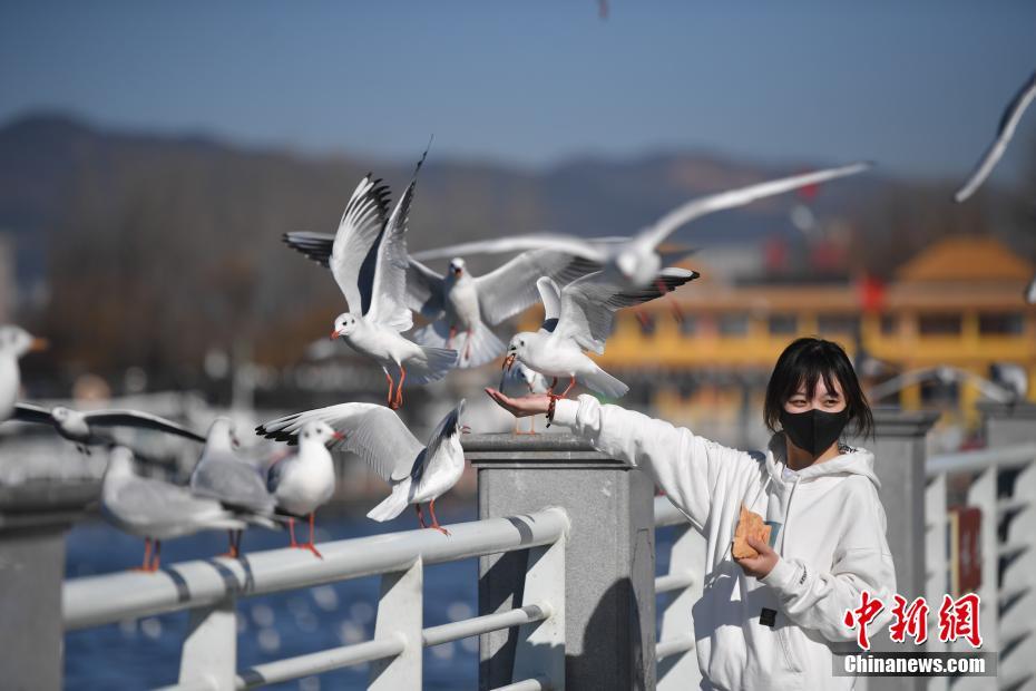 1月5日,滇池邊喂紅嘴鷗的女孩。近期“春城”昆明氣溫宜人,進入最佳觀鷗季。 中新社記者 劉冉陽 攝