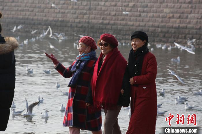游客在海邊與海鷗互動(dòng)!∫鹿诔 攝