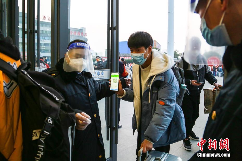 1月12日,陜西安康,K5482次列車(chē)從安康車(chē)站啟動(dòng),滿(mǎn)載1126名學(xué)子駛向?qū)氹u,踏上回家路。這是在近期疫情影響下,中國(guó)鐵路西安局集團(tuán)有限公司開(kāi)行的新年首趟點(diǎn)對(duì)點(diǎn)學(xué)生專(zhuān)列。圖為學(xué)生掃碼進(jìn)入安康車(chē)站。 中新社發(fā) 熊?chē)?guó)棟 攝