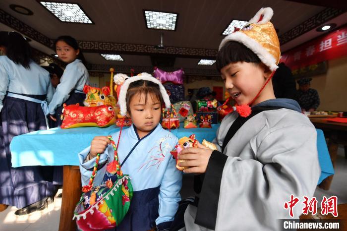 兩名頭戴布藝虎頭帽的小朋友欣賞布老虎!⊥鹾I 攝