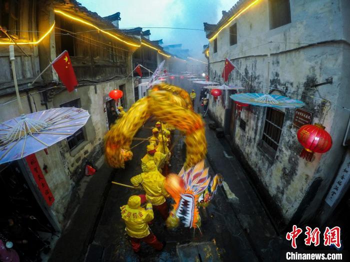 1月25日,胡樂(lè)司龍燈隊(duì)在安徽省寧國(guó)市胡樂(lè)鎮(zhèn)胡樂(lè)村走街串巷,展示非遺文化!±顣约t 攝