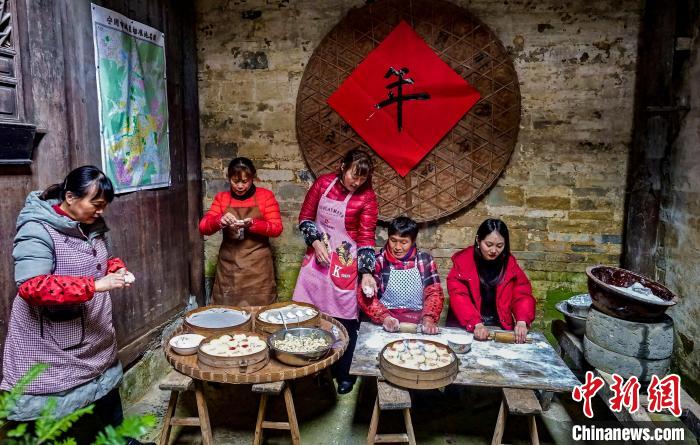 1月25日,在安徽省寧國(guó)市胡樂(lè)鎮(zhèn)胡樂(lè)村,村民們準(zhǔn)備胡樂(lè)水餡包、胡樂(lè)印子粿等過(guò)年傳統(tǒng)美食!±顣约t 攝