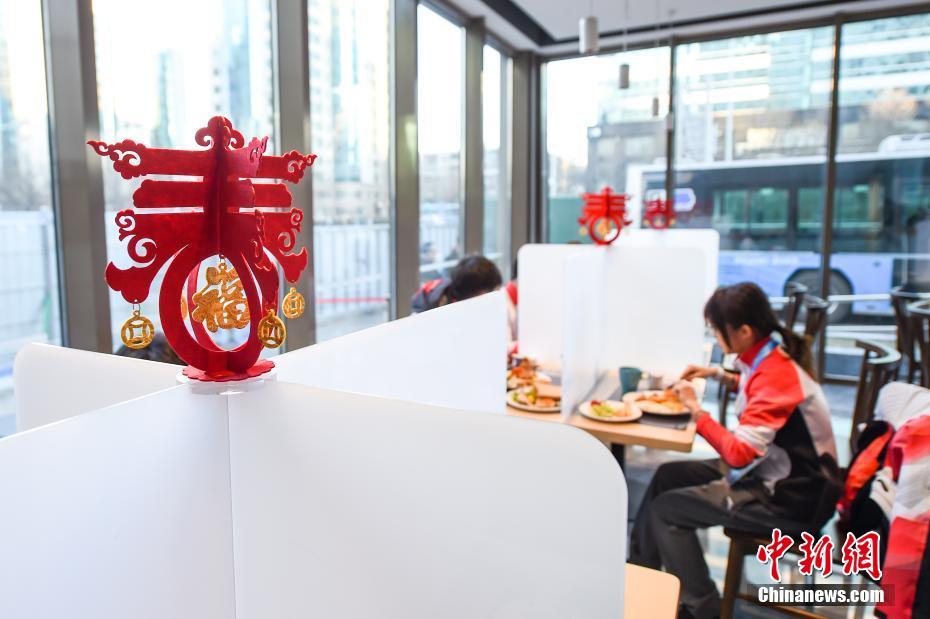 北京冬奧會(huì)將于2022年2月4日開(kāi)幕,與中國(guó)農(nóng)歷虎年春節(jié)“完美邂逅”,純潔的冰雪將與熱烈的中國(guó)紅在這里“相遇”。日前,北京冬奧村、北京冬奧會(huì)主媒體中心以及北京冬奧服務(wù)保障酒店等地,在“福”字、紅燈籠、春聯(lián)、剪紙、中國(guó)結(jié)等的點(diǎn)綴下,洋溢著濃濃的春節(jié)氛圍。圖為1月27日,一冬奧服務(wù)保障酒店內(nèi),新春裝飾將餐廳裝扮得年味十足。 中新社記者 何蓬磊 攝