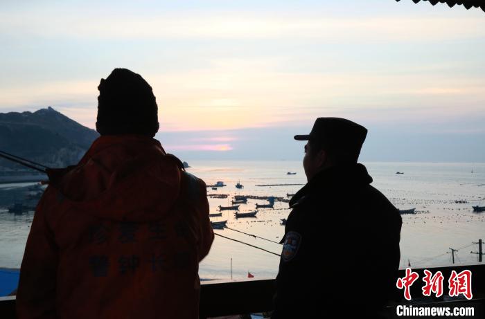 清晨,民警侯浩與漁民在“望風(fēng)亭”觀察海面情況,侯浩的新年愿望是海島的每天都平安,回家的時(shí)候沒有風(fēng)!》揭 攝