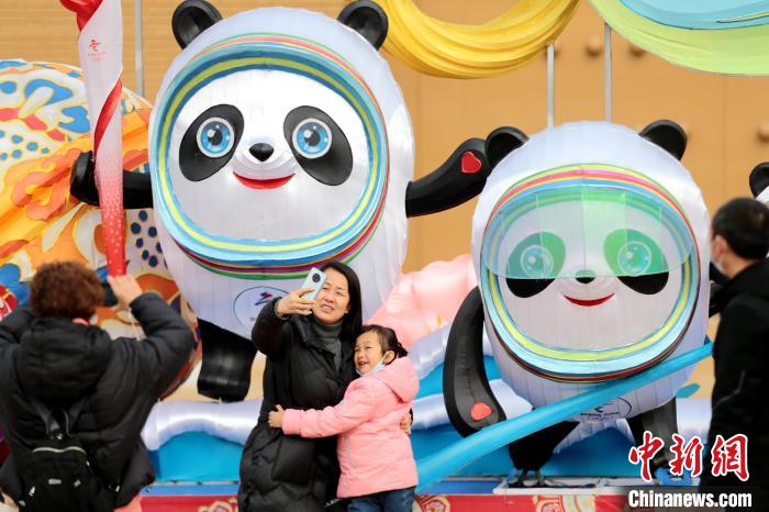 2月8日,陜西西安,一組“冰墩墩”彩燈亮相丹鳳門前,市民爭(zhēng)相與之合影。張遠(yuǎn) 攝