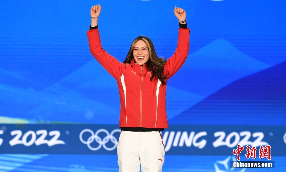 2月8日晚,北京冬奧會(huì)自由式滑雪女子大跳臺(tái)頒獎(jiǎng)儀式在北京頒獎(jiǎng)廣場(chǎng)舉行。圖為獲得冠軍的中國(guó)選手谷愛凌在頒獎(jiǎng)儀式上。 中新社記者 李駿 攝