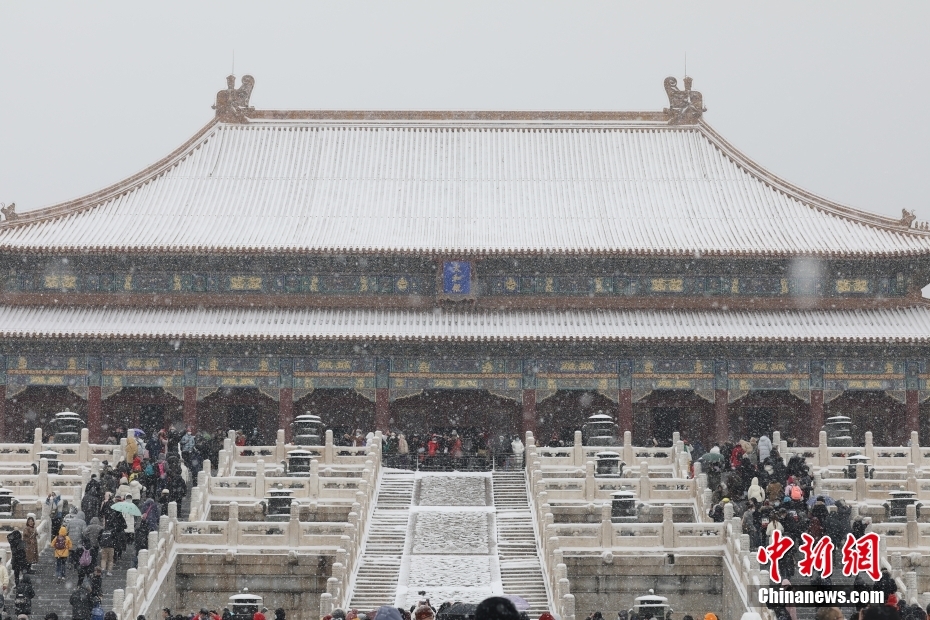 2月13日,北京迎來農(nóng)歷壬寅虎年首場降雪,民眾在雪中游覽故宮。 中新社記者 盛佳鵬 攝