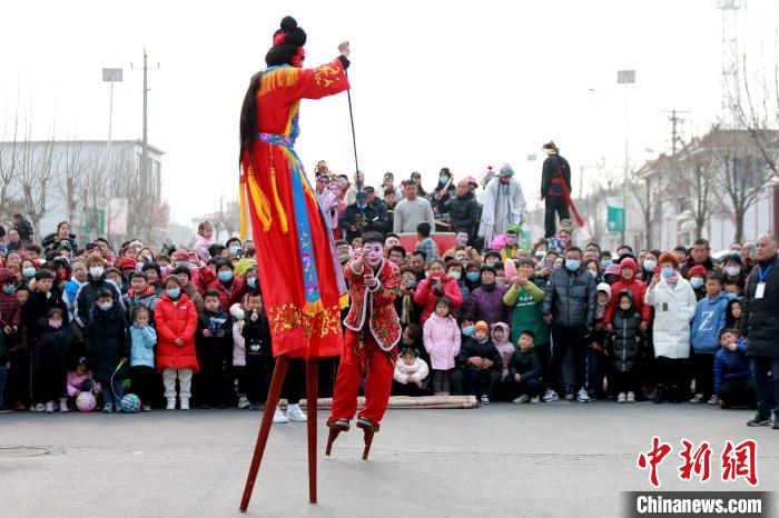2月13日,元宵節(jié)前夕,民眾在山東濟南柿子園村觀看濟南西關(guān)高蹺隊的精彩表演,賞民俗歡度春節(jié)!×籂 攝